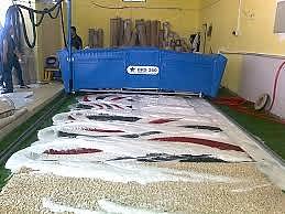 Halılar fabrikamıza geldikten sonra cinslerine göre ayrılır ve yıkamaya girmeden önce son sistem toz alma makinaları ile tozları alınmaktadır. Bu işlem sırasında Halıların içerisindeki toz, kum, saç kılları ve tüylerden arındırılmış olur.